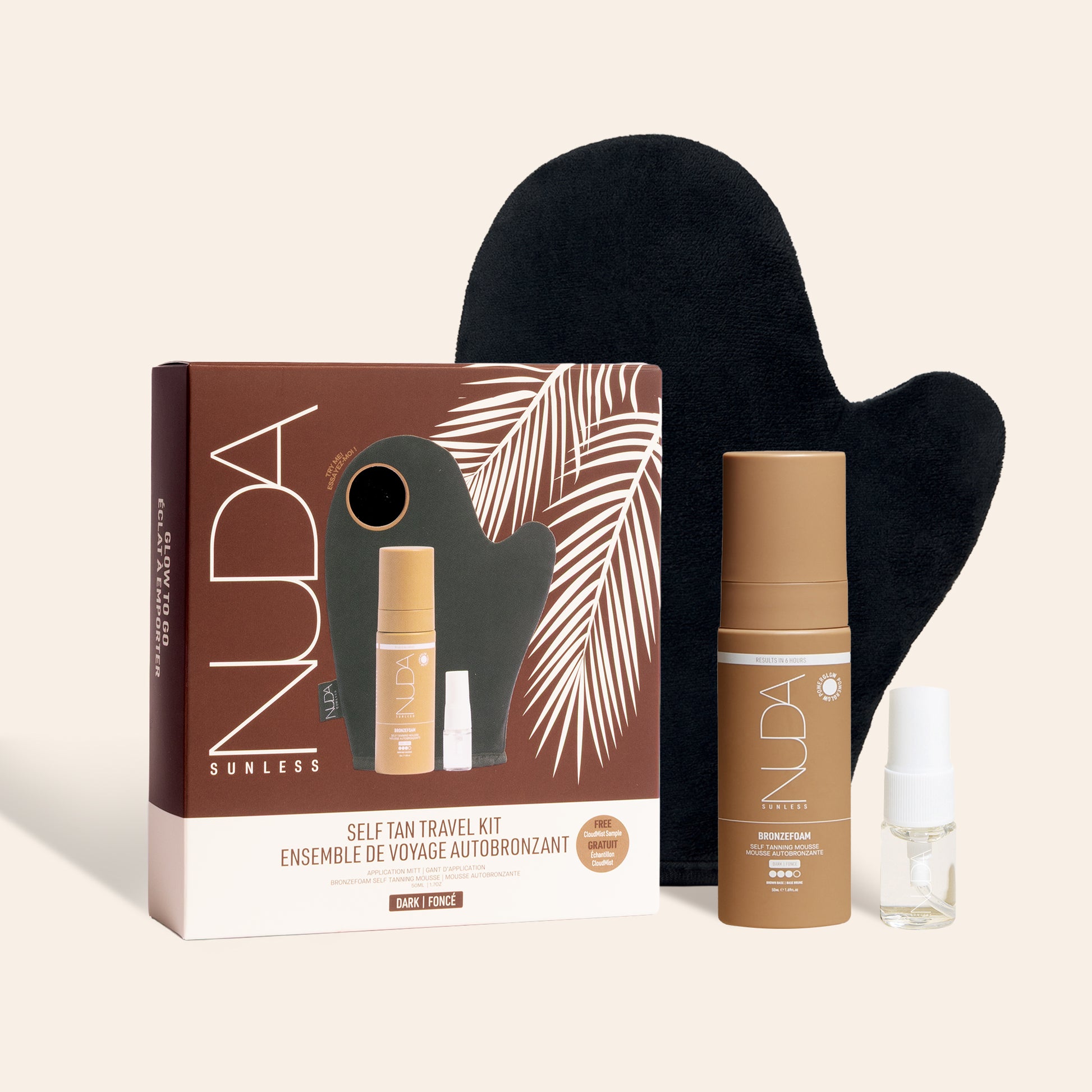 Obtenez un teint bronzé de vacances grâce à nos essentiels autobronzants pour le voyage. Comprend : la mousse autobronzante BronzeFoam, l'eau autobronzante visage CloudMist et un gant de bronzage. Conforme aux normes TSA.